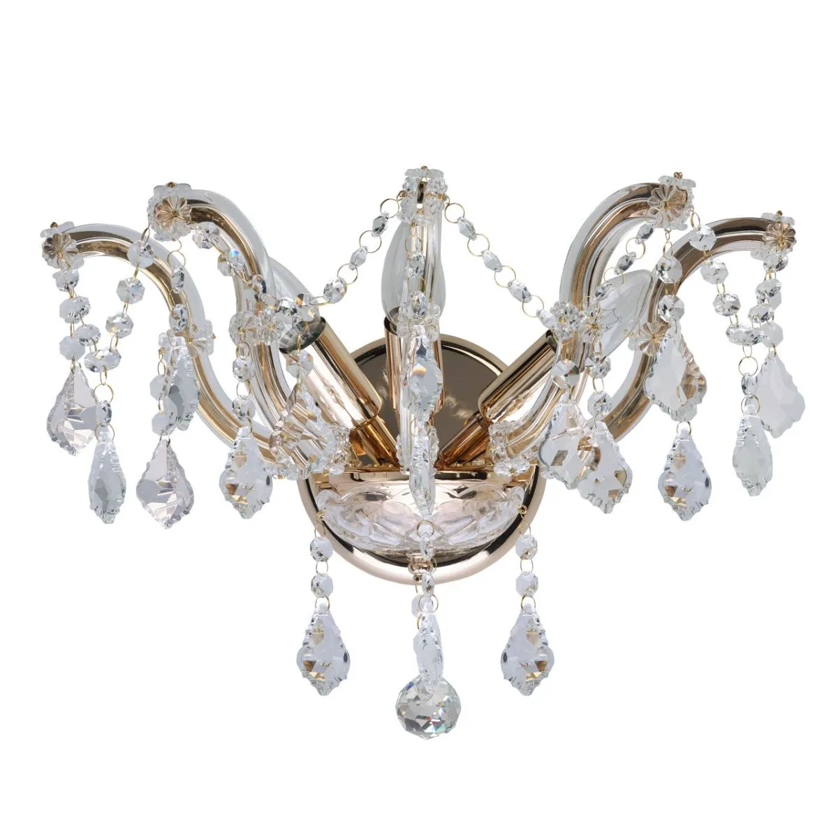 Металлическое основание цвета золота, декоративные элементы из дутого прозрачного стекла, хрустальны