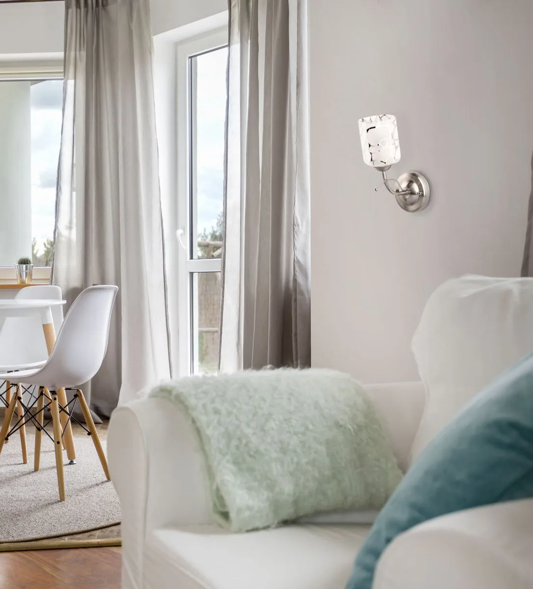 Металлическое основание цвета матового хрома, стеклянный плафон с гальванизированным рисунком.